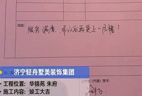 貴府的工程已全部圓滿竣工并通過了竣工驗收,感謝您在整個過程中對于我們的理解、支持和包容。輕舟美住裝飾王洪綱工作室提前恭賀您和家人喬遷新居,恭祝您和家人生活幸福美滿、事業蒸蒸日上。